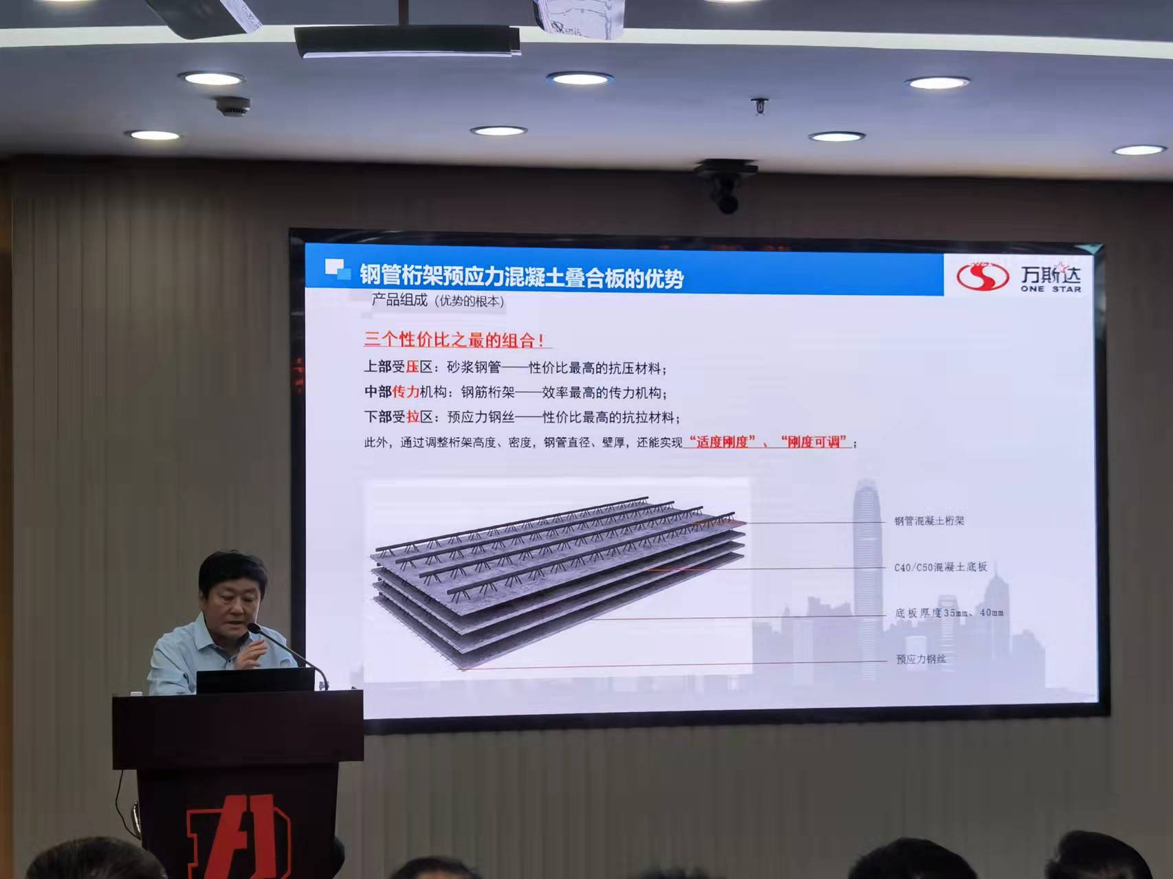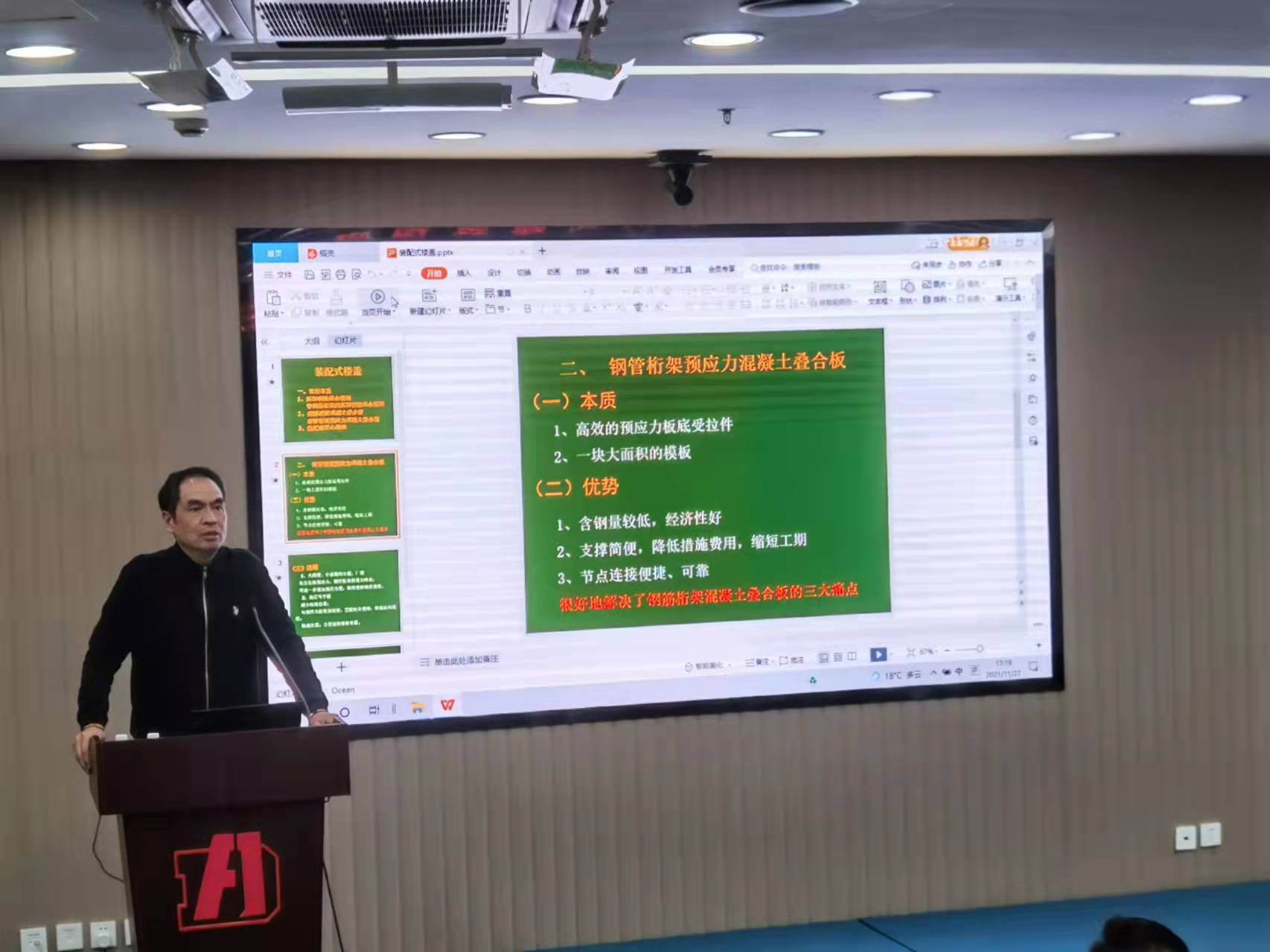 隨后福州大學高級教授沈為民上臺發(fā)言,沈教授結合自身經驗首先對裝配式樓蓋體系進行了介紹,隨后對鋼管桁架預應力混凝土疊合板(PK3型板)的本質與優(yōu)勢進行了剖析與講解。