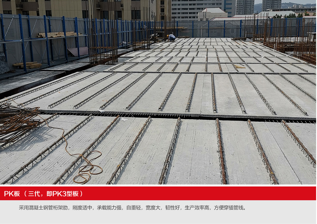 PK板專利技術(shù)1999年由周緒紅院士和吳方伯教授開始研發(fā),2004獲得發(fā)明專利,2008年榮獲得國家科技進(jìn)步二等獎(jiǎng),在周緒紅院士的持續(xù)指導(dǎo)下,產(chǎn)品不斷完善,2018年第三代產(chǎn)品-鋼管桁架預(yù)應(yīng)力混凝土疊合板(PK3型板)成熟后并推向市場,獲得了一致好評。2018年6月,經(jīng)原同濟(jì)大學(xué)副校長、國家裝配式建筑技術(shù)中心主任李國強(qiáng)教授為組長的鑒定委員會鑒定:各項(xiàng)性能達(dá)到國際領(lǐng)先水平,對目前國內(nèi)通用的量大面廣的普通桁架疊合板是一種技術(shù)飛躍,極大提升了性價(jià)比。